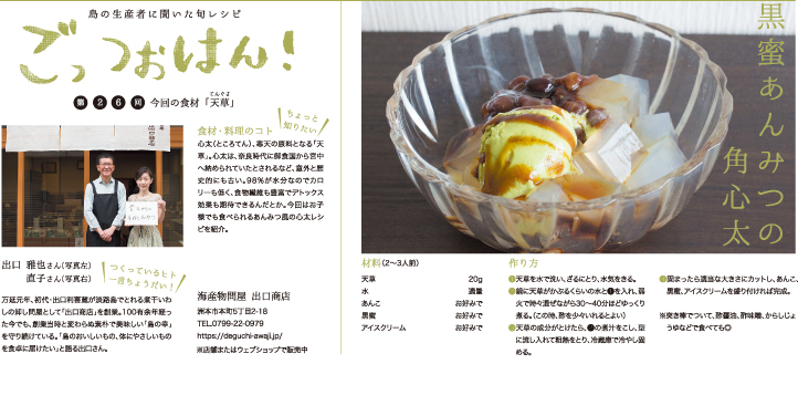 心太(ところてん)は寒天の材料となる「天草」からできています。今月は出口商店さんに教わった、お子様でも食べやすいあんみつ風のレシピです。