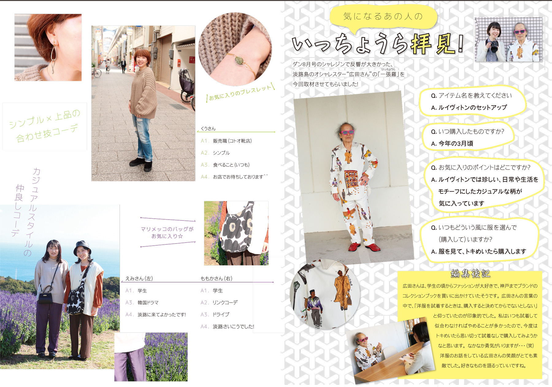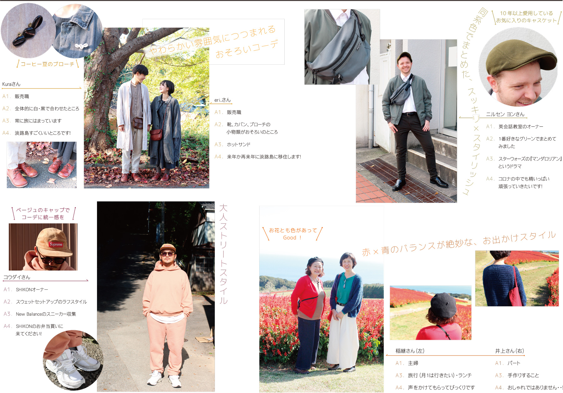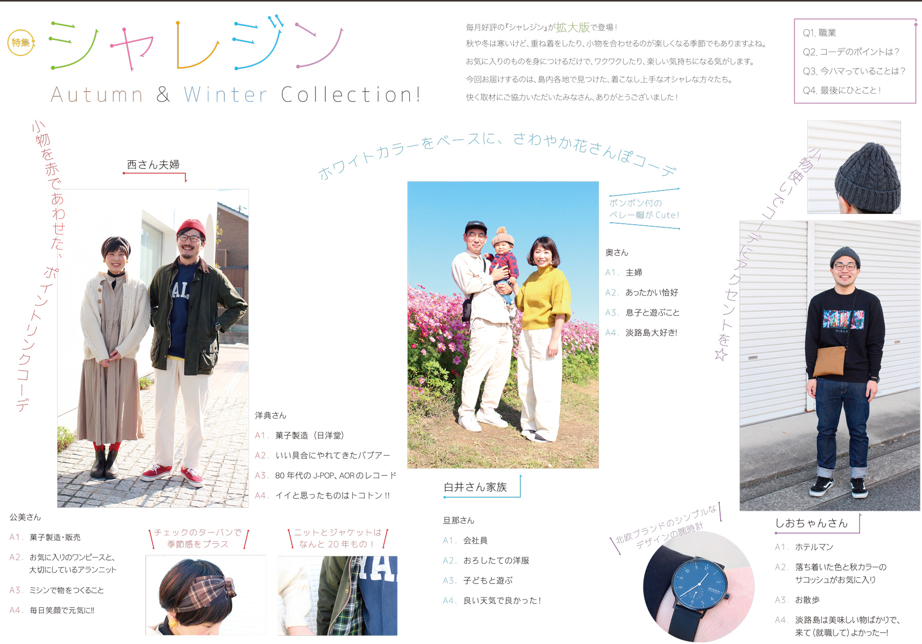 毎月好評の「シャレジン」が拡大版で登場!秋や冬は寒いけど、重ね着したり、小物を合わせるのが楽しくなる季節でもありますよね。お気に入りのものを身に着けるだけで、ワクワクしたり、楽しい気持ちになる気がします。今回お届けするのは、島内各地で見つけた、着こなし上手なオシャレな方々たち。快く取材にご協力いただいたみなさん、ありがとうございました!
