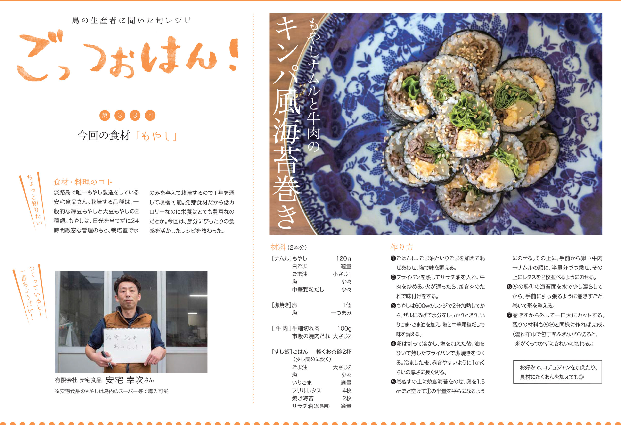 今月は節分にもぴったり、もやしの食感を活かした、キンパ風海苔巻きをご紹介。牛肉入りで食べ応えも抜群!