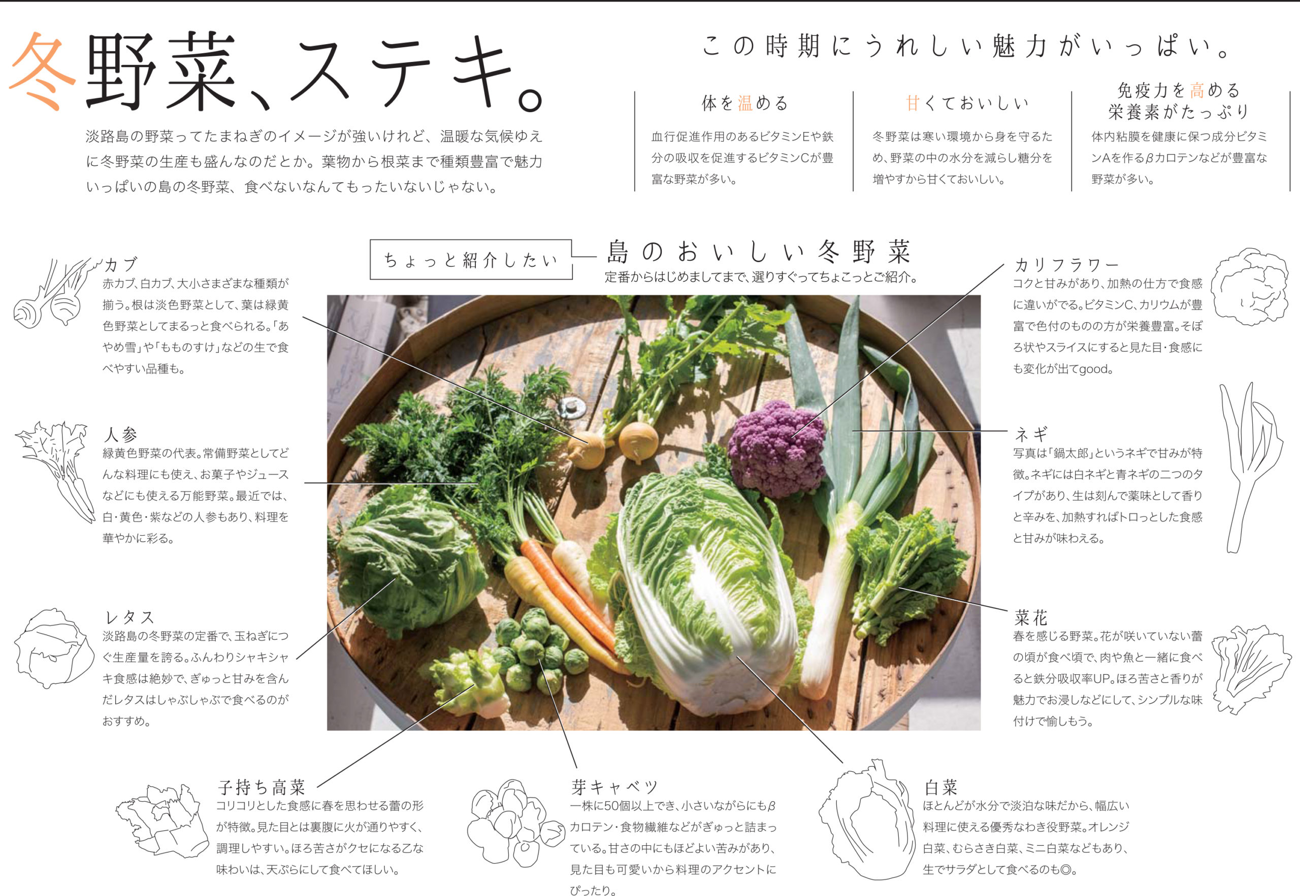 淡路島の野菜はたまねぎのイメージが強いけれど、温暖な気候ゆえに冬野菜の生産も盛んなのだとか。魅力いっぱいの島の冬野菜、食べないなんてもったいないじゃない。