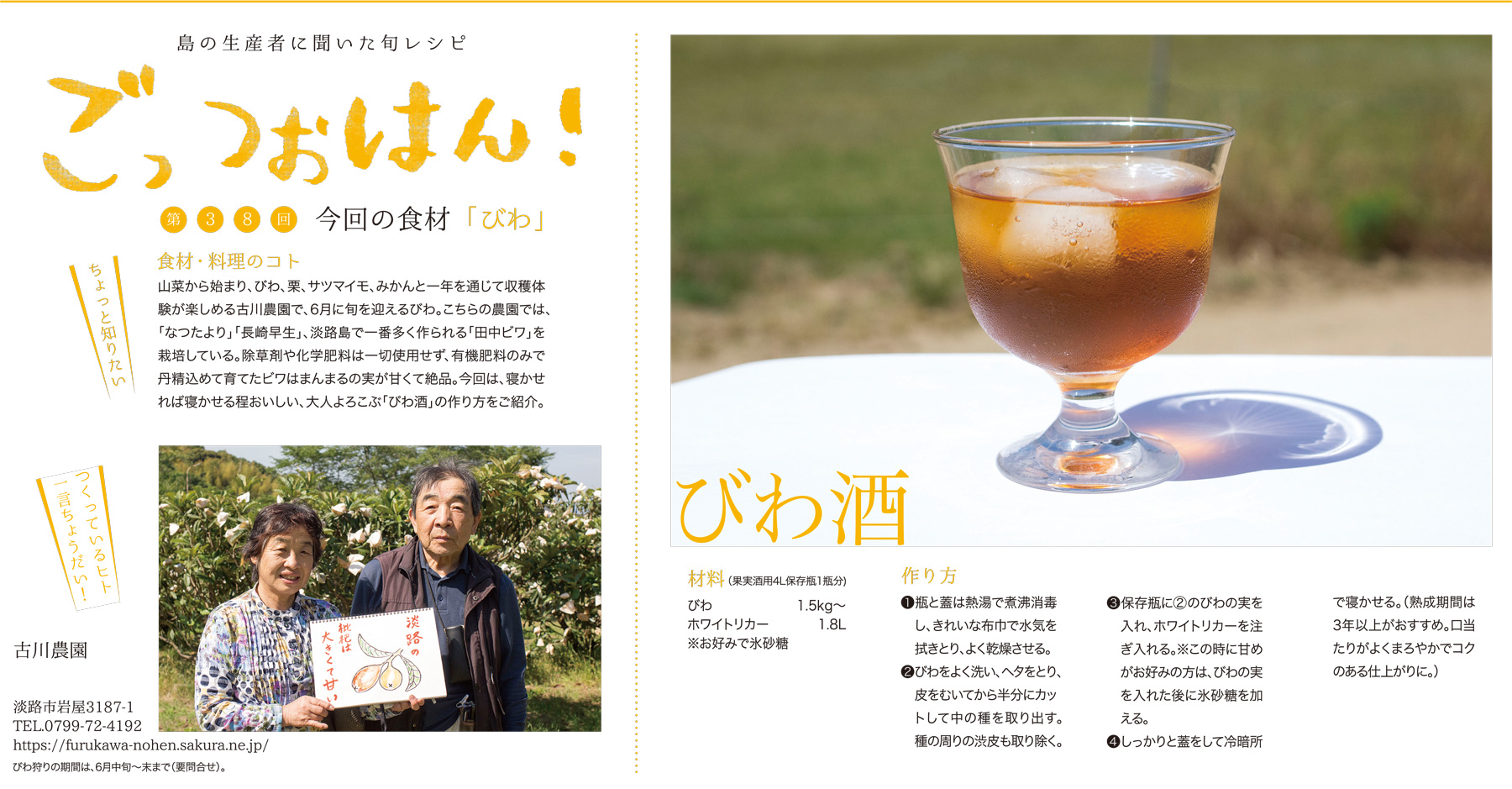 今月は、寝かせれば寝かせる程おいしい、大人よろこぶ「びわ酒」の作り方をご紹介。