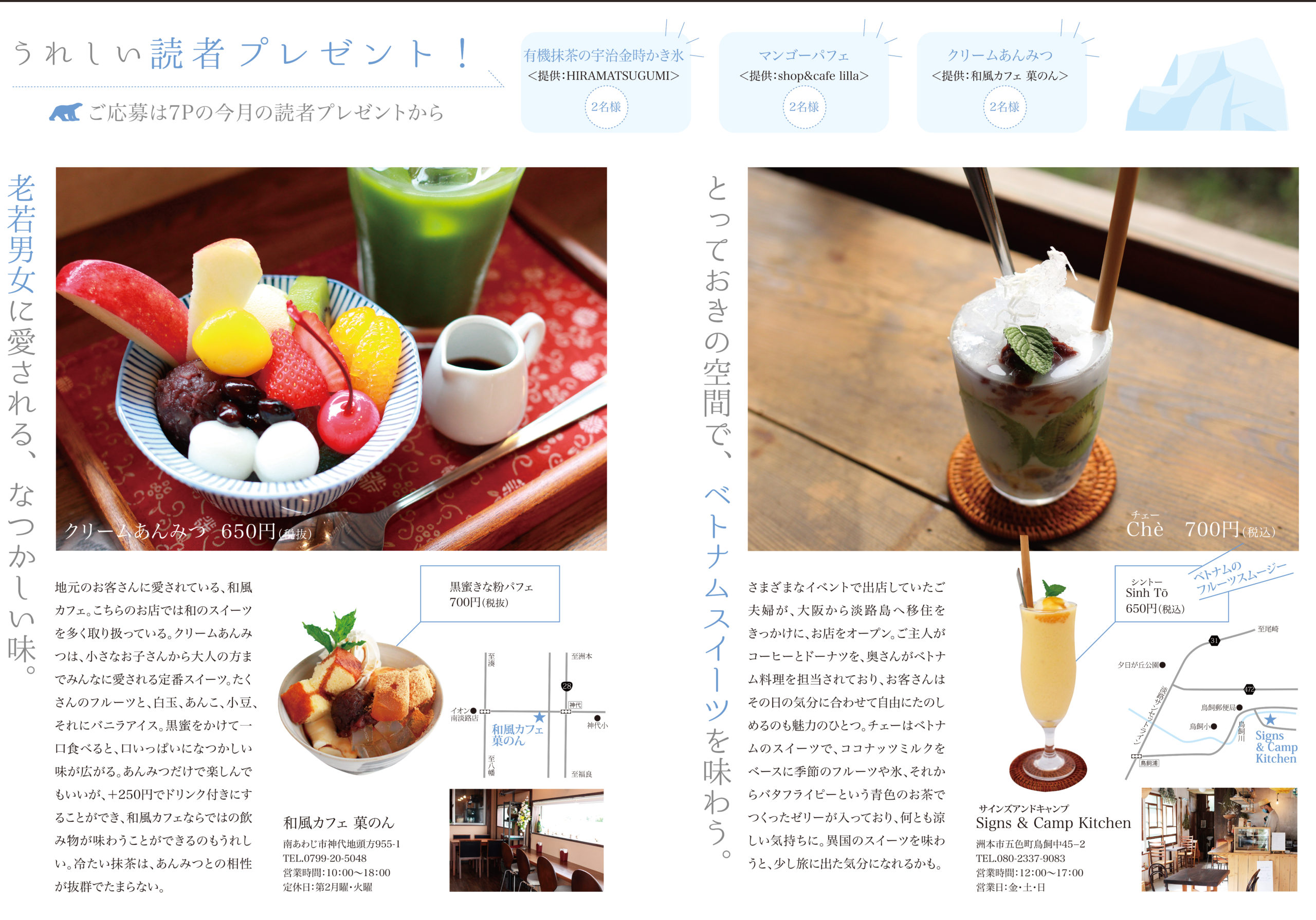 夏はひんやりスイーツが恋しくなる季節。今月は島内で楽しめる、様々なひんやりスイーツをご紹介。夏の花さんぽコーナーも。