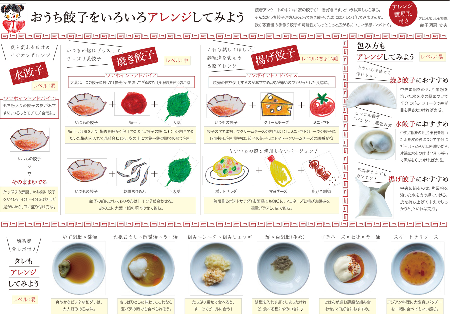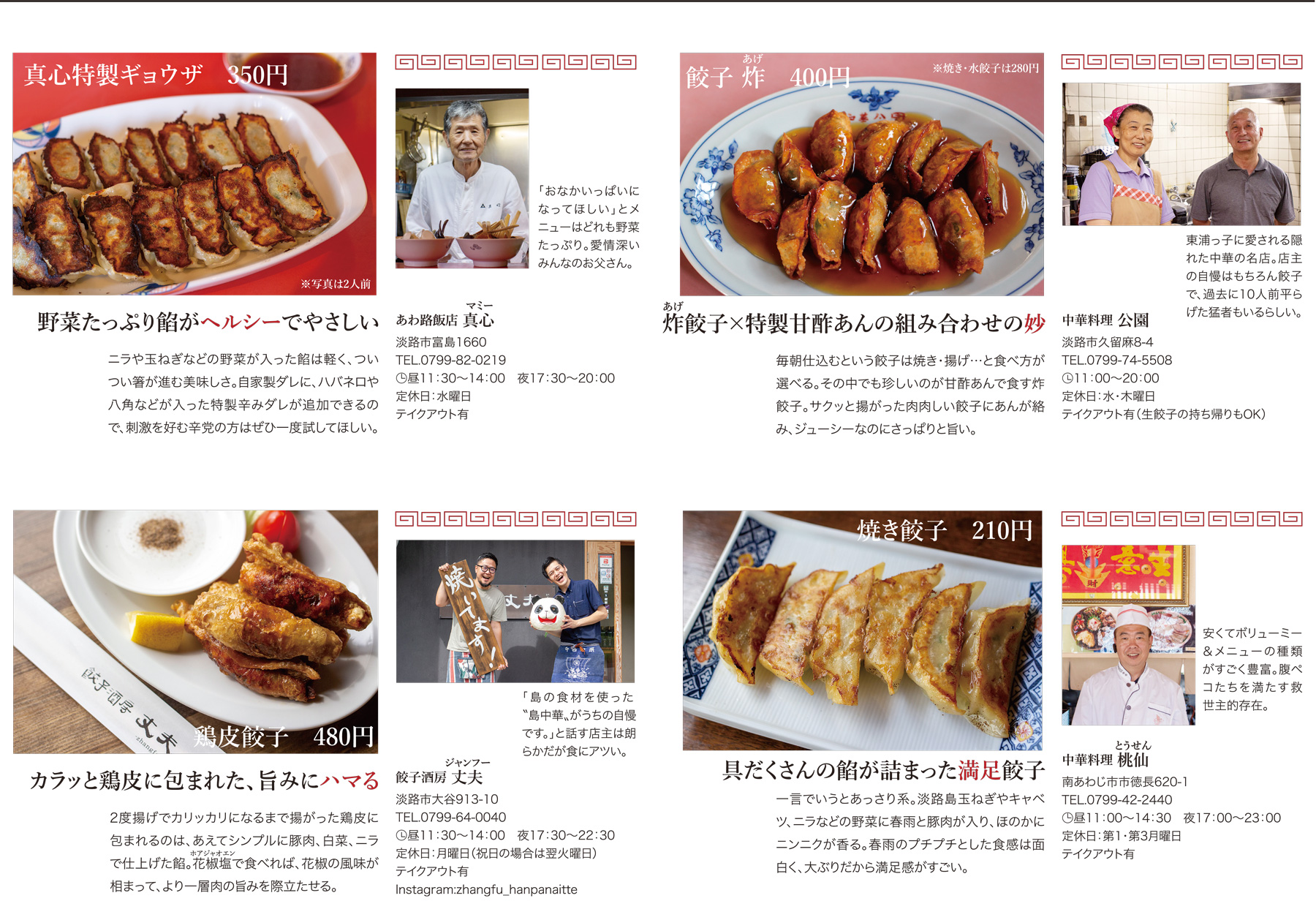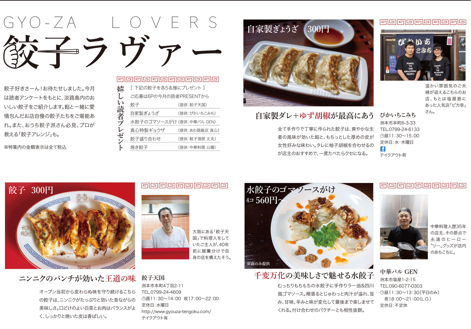 餃子好きさーん!お待たせしました。今月は読者アンケートをもとに、淡路島内のおいしい餃子をご紹介します。餡と一緒に愛情包んだお店自慢の餃子たちをご堪能あれ。また、おうち餃子派さん必見、プロが教える「餃子アレンジ」も。