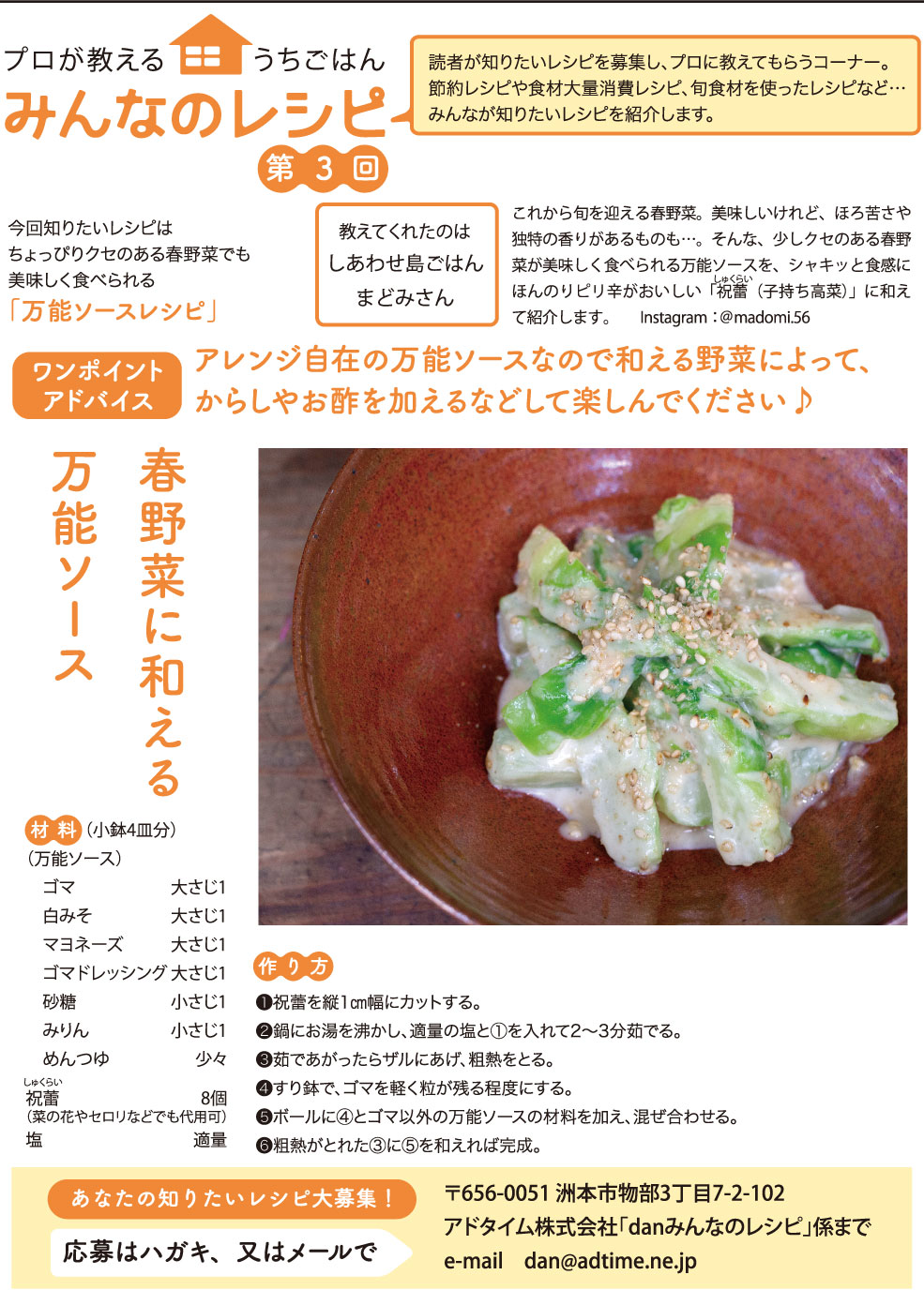 ちょっぴりクセのある春野菜を美味しく食べられる万能ソースレシピです。分量も覚えやすいくカンタンだから、いろんな野菜に和えて召し上がれ♪