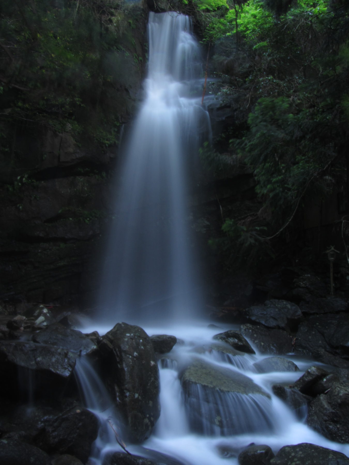 「深山の谷深きところにあって、かつては修験の場の滝場として神変大菩薩が祀られ、凛とした存在感を示しています。修験者と出遇いそうな独特な雰囲気があり、岩場には彫刻などがあり、歴史を感じる趣き深い瀑布※です。」