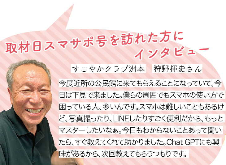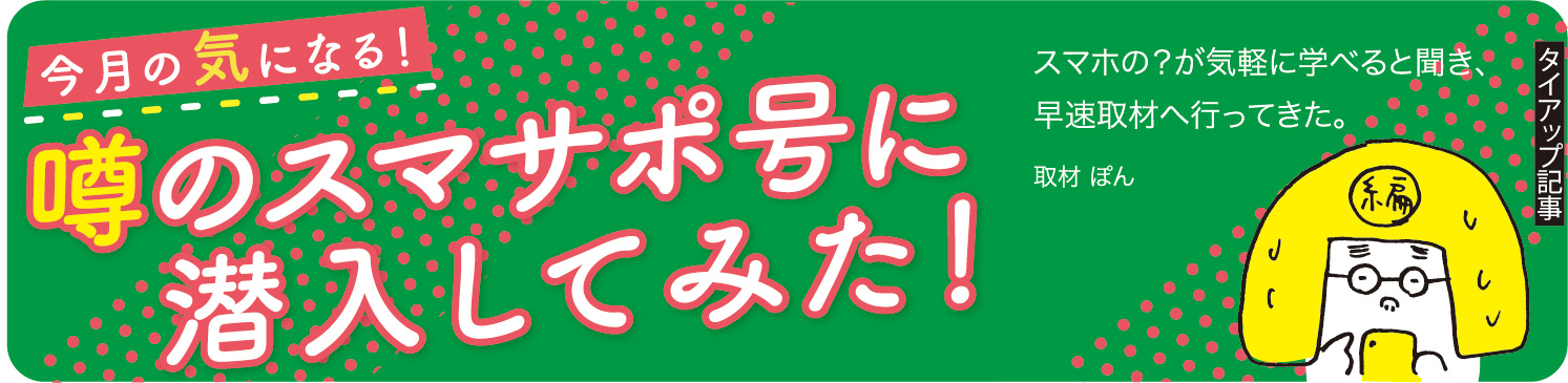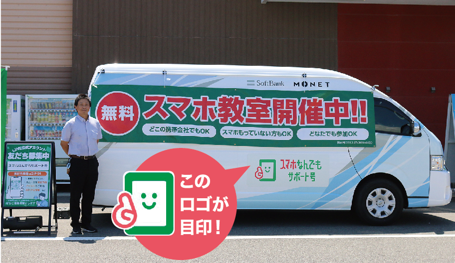 自動車の車内を会場に、現地スタッフやオンライン講師のサポートを受けながら、スマホの使い方を学ぶことができるスマサポ号。行政サービスのデジタル化や地域活性化に向け、スマホに不慣れなシニア世代をフォローアップする取り組みとして始まり、島内ソフトバンクショップを運営する㈱ニッケ・マーキュリーが関西で先駆けてここ淡路島に導入。取材日はPLANT淡路に出動しており、スタッフさんがにこやかに出迎えてくれた。