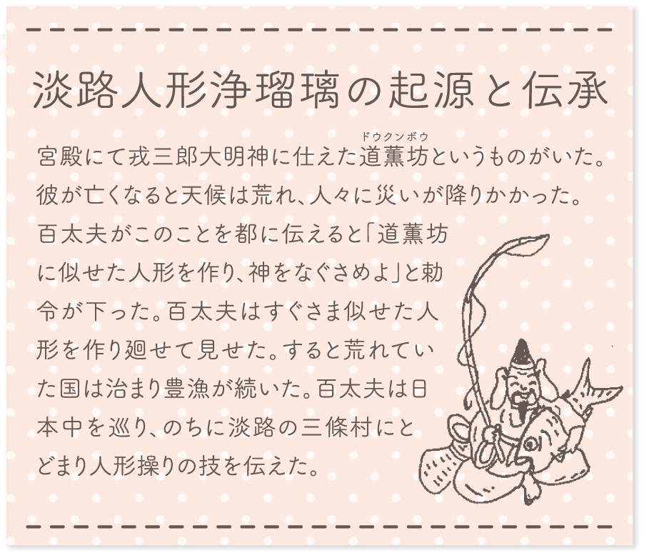 この人形操りがのちの「淡路人形浄瑠璃」の起源とされています。早替わりや道具返しなどケレン味(大がかりで派手な演出)を加え、独自の演出で人々を喜ばせる淡路人形浄瑠璃。最盛期には40以上もの人形座があり、全国を巡業していました。昭和30年ごろまでは、淡路島の漁村で行われる漁祭で大漁や航海の安全を祈り「戎舞」が演じられ、現在も国生み伝承に縁のある戎さまが主演を務める「戎舞」は淡路人形座で演じられています。国内だけでなく世界にも活躍の幅を広げ、世界中に「戎さま」の福をもたらしています。